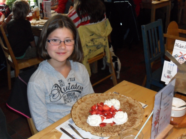 Anouk had een pannenkoek met aarbeien en slagroom.